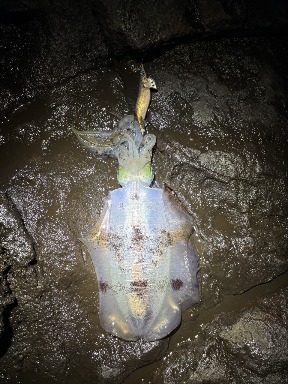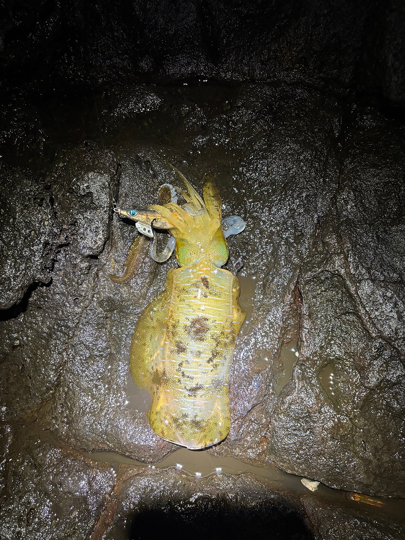 사용에기는? 야마시타 에기왕K 3.0호 금아지, 해동 피나투라 3.0호 에기(마블속지), 시마노 클린치부스트(수장되었음), 야마시타 에깅왕K 블루포션 3.5호 4종류의 에기로 히트했습니다. 특히, 3.0호 금아지와 피나투라 에기에 무늬오징어들의 반응이 너무 좋았습니다.